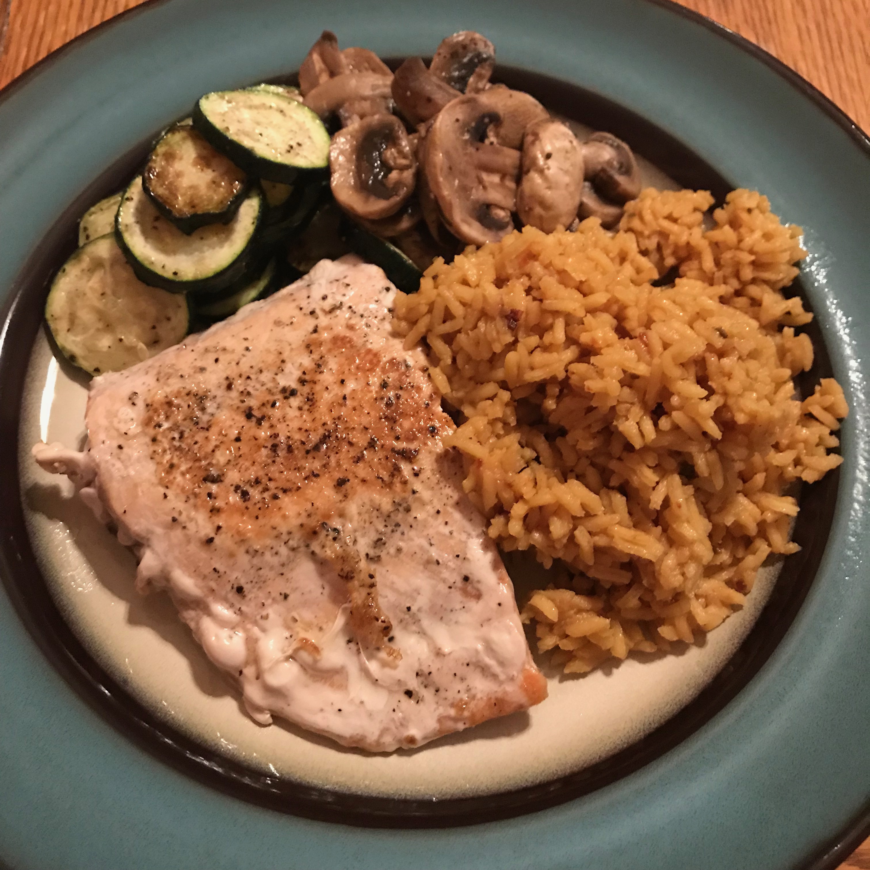 팬에 구운 연어에다가 멕시칸 라이스, 애호박이랑 버섯.