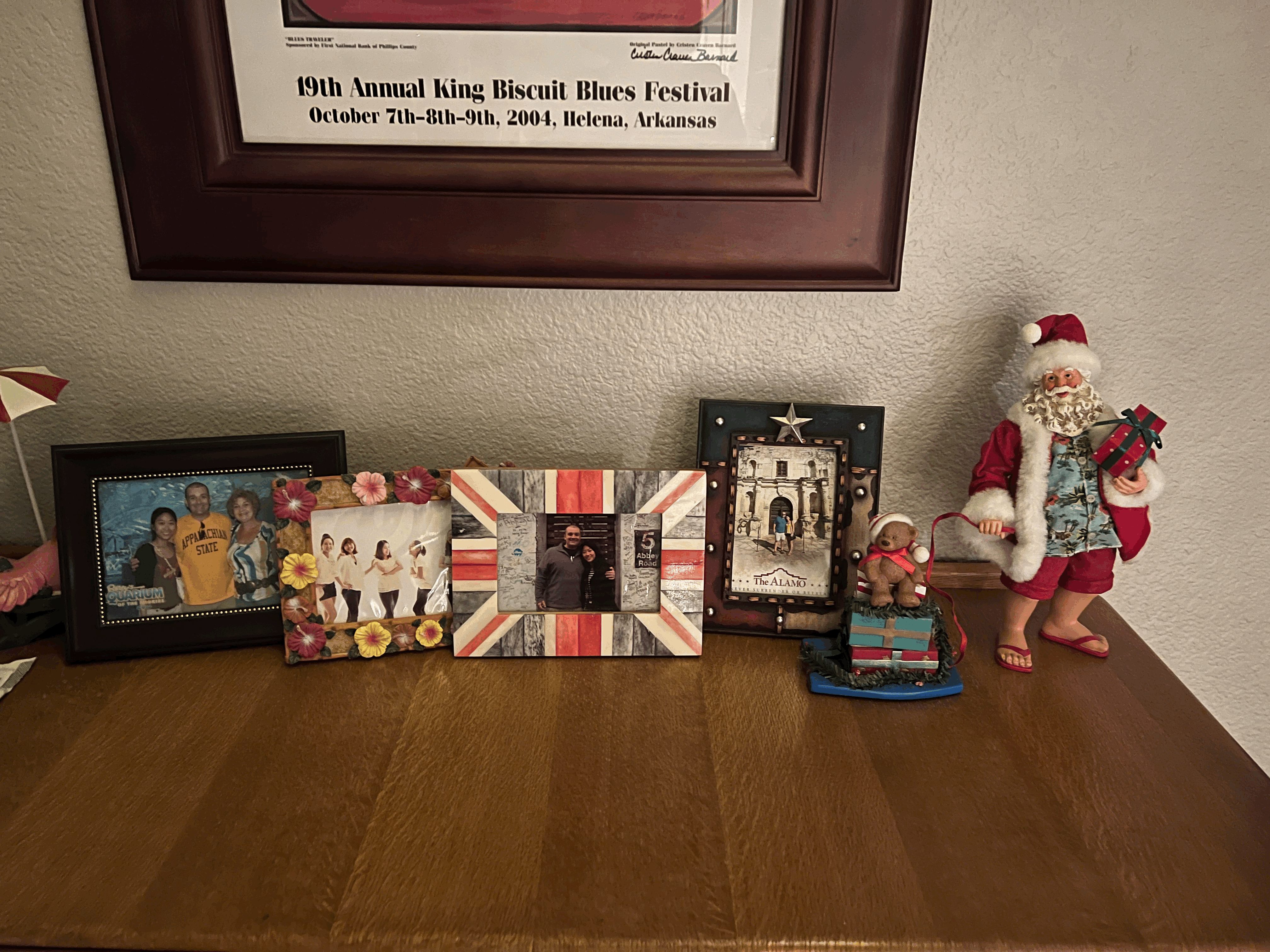 하와이안 셔츠 입은 산타랑 서핑보드 타는 곰돌이 수줍게 사진들 옆에 자리했어요.